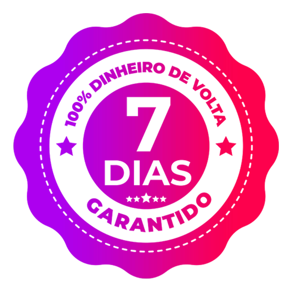 Eu ofereço uma garantia de 7 dias para você ter certeza que está em um ambiente seguro e que terá a transformação que tanto sonha, se não ficar satisfeita ou se arrepender por qualquer outro motivo, basta me enviar um e-mail e eu devolvo 100% do seu dinheiro. Sem questionamentos e sem burocracia.